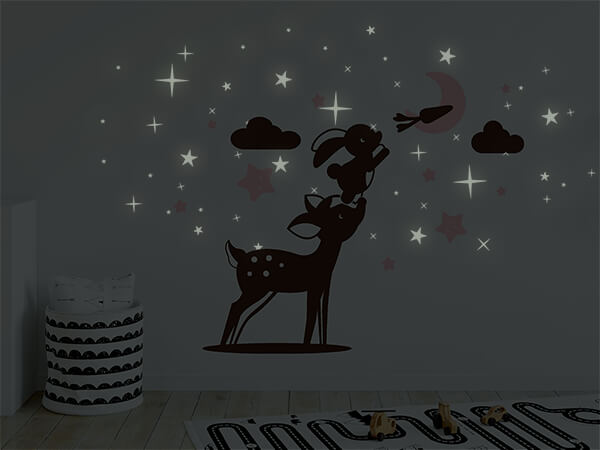 Wandtattoo Leuchtsterne im Dunkeln mit Hase und Reh