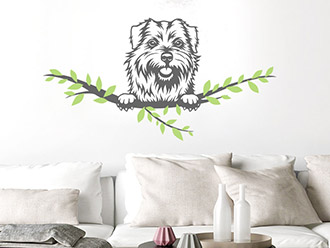 Wandtattoos sind in vielen verschiedenen Farben erhältlich. Auf jeder Produktseite können Sie Farbe und Größe des Hunde-Wandtattoos nach den eigenen Wünschen auswählen. Die Hundeköpfe mit Ast sind zweifarbig. Hundekopf/Ast haben die selbe Farbe, die Blätter des Astes haben eine andere Farbe. Wie die Farbkombination am Ende aussehen soll, entscheiden Sie einfach selbst. Unsere Tipps: Stimmen Sie die Farben des Motivs auf die restliche Dekoration ab. Oder nutzen Sie stilvolle Grau- und Beigetöne für das Wandtattoo. Diese neutralen Farben passen an den meisten Stellen und ergänzen das Ambiente der Wohnung und des Hundeplatzes ganz besonders gut. Beispiel: Ast/Kopf in Dunkelgrau oder Braun, Blätter in Olive, Hellbraun oder Beige.