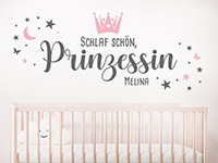 Mit dem märchenhaften Wandtattoo Schlaf schön Prinzessin mit Name setzen Sie bunte Wandakzente im Baby- oder Kinderzimmer.