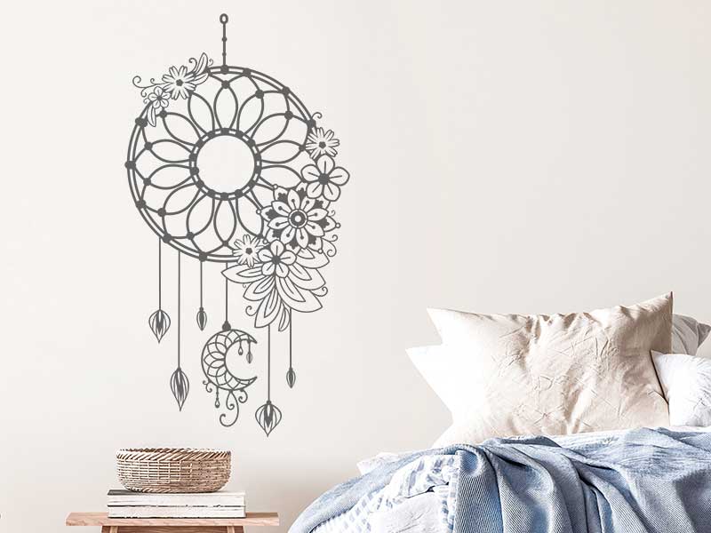 Der üppige Wandtattoo Boho Traumfänger mit Blüten, Federn und Ornamenten ist ein toller Blickfang für Ihr Zuhause oder beispielsweise auch ein zauberhaftes Dekoelement für Ihre Hochzeitsdekoration im Boho Stil.