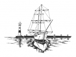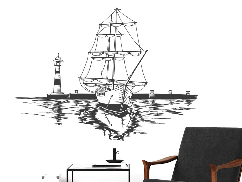 Das maritime Wandtattoo Schiff im Hafen schafft mit dem Segelschiff und dem Hafen mit Leuchtturm im Hintergrund eine tolle Urlaubsatmosphäre im Wohnbereich, Badezimmer oder auch im Flur.