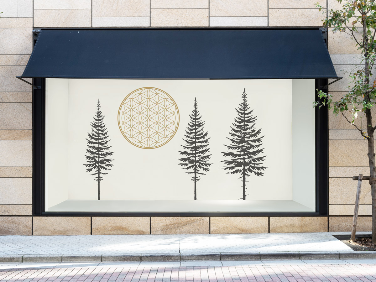 Nicht nur im Schaufenster top: Die Blume des Lebens mit Tannenbäumen kombiniert