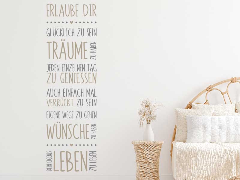 Mit dem inspirierenden Wandtattoo Erlaube dir zu leben erinnern Sie sich täglich wieder daran, das Leben nach Ihren eigenen Wünschen und Vorstellungen zu gestalten.